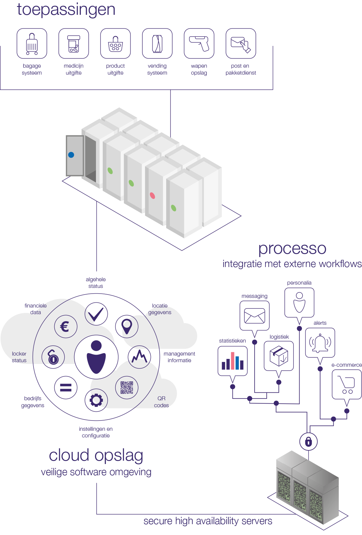 Informatieoverdracht is van vitaal belang. Daarom wordt ieder lockersysteem standaard voorzien van Processo. Met Processo wordt uw lockersysteem volledig integreerbaar met uw eigen systemen. Processo is een zwaar beveiligde en intelligente hub tussen het lockersysteem en uw interne systemen. Event gedreven overdracht van informatie en processen worden door middel van Processo eenvoudig en intuïtief gerealiseerd.